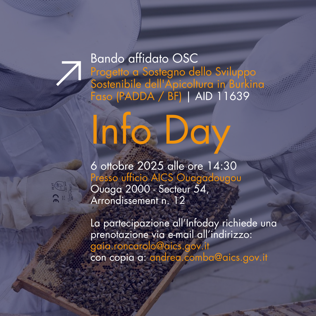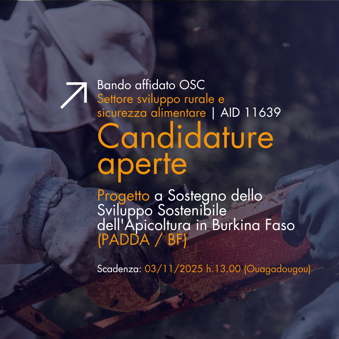 È stato pubblicato l’Avviso per l’affidamento della realizzazione dell’iniziativa “Progetto a Sostegno dello Sviluppo Sostenibile dell’Apicoltura in Burkina Faso (PADDA/BF)” – AID 011639/01/4.